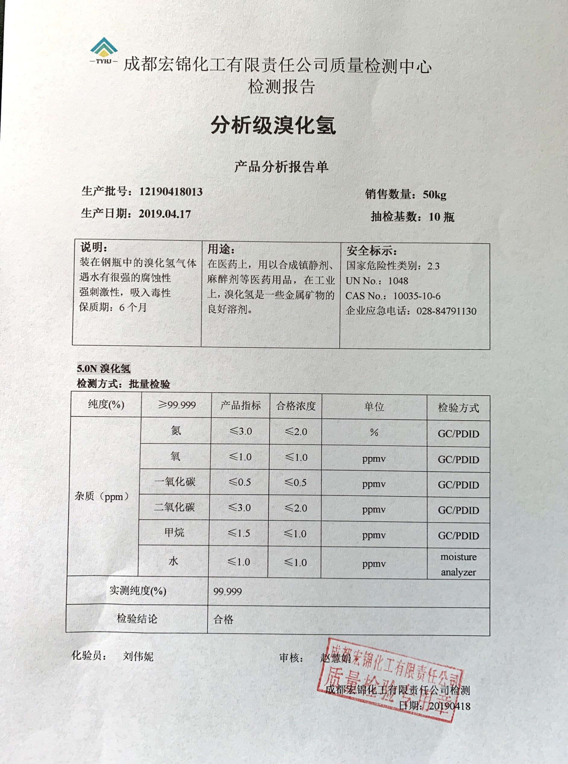 溴和氢的化合物,是一种强酸。微发烟。分子量80.92,气体相对密度(空气=1)3.5;液体相对密度2.77(-67℃)。