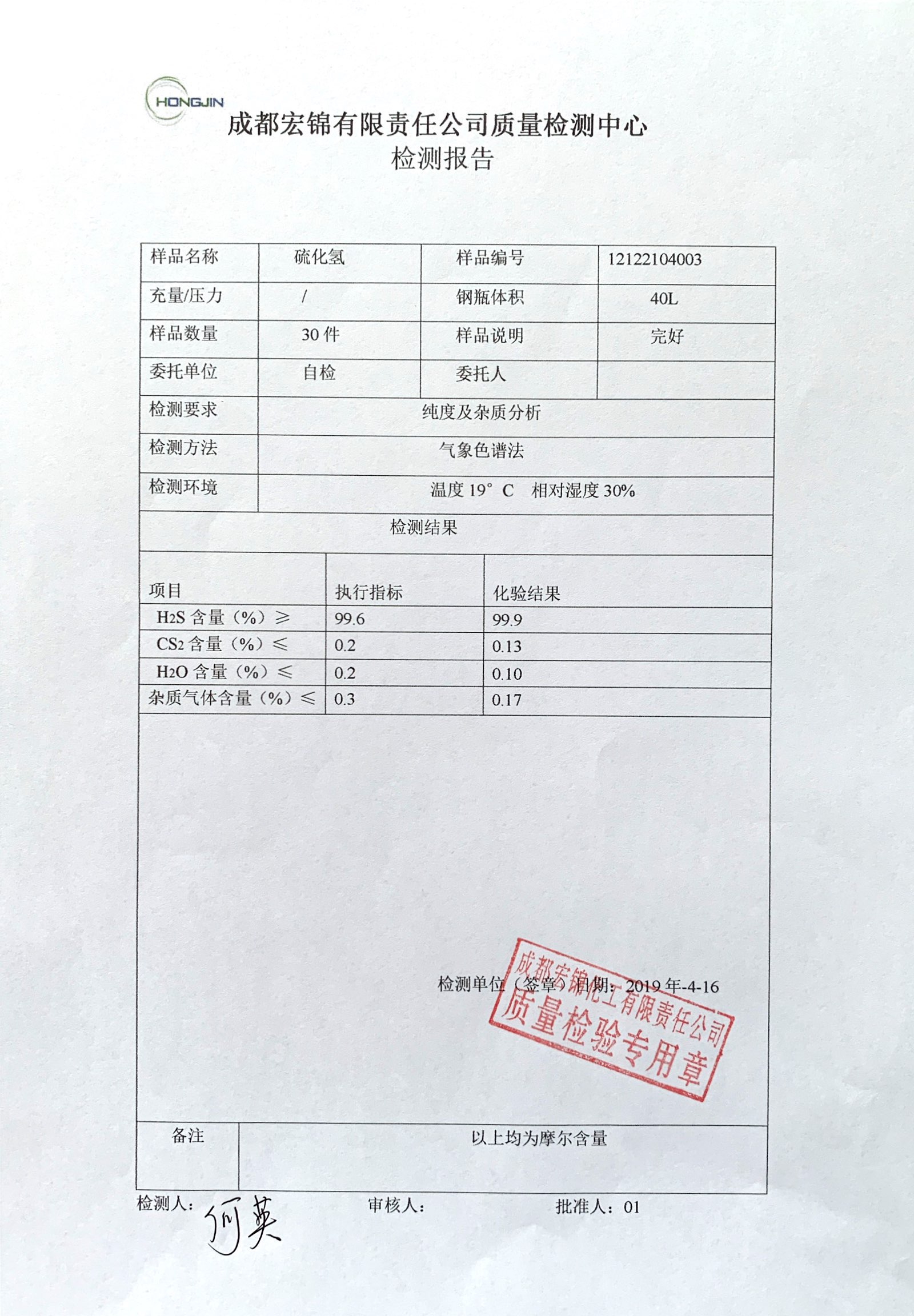 硫化氢质量检测报告